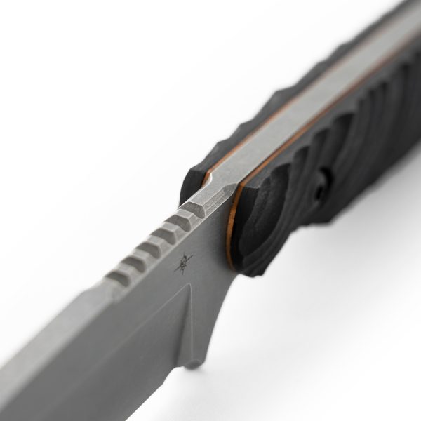 The edge features a 2.75” straight for fine work, and a razor sharp 1.75” radius to the tip for traditional blade work. This Dealer Exclusive Field 2.0 features a Natural Stone blade finish, and the blade shape allows for much more steel mass behind the edge, which translates to a longer sharpening life and edge impact resistance. A perfect 90-degree spine, from the tip all the way to the thumb jimping, provides more surface area for hammering and ferro rod sparking.